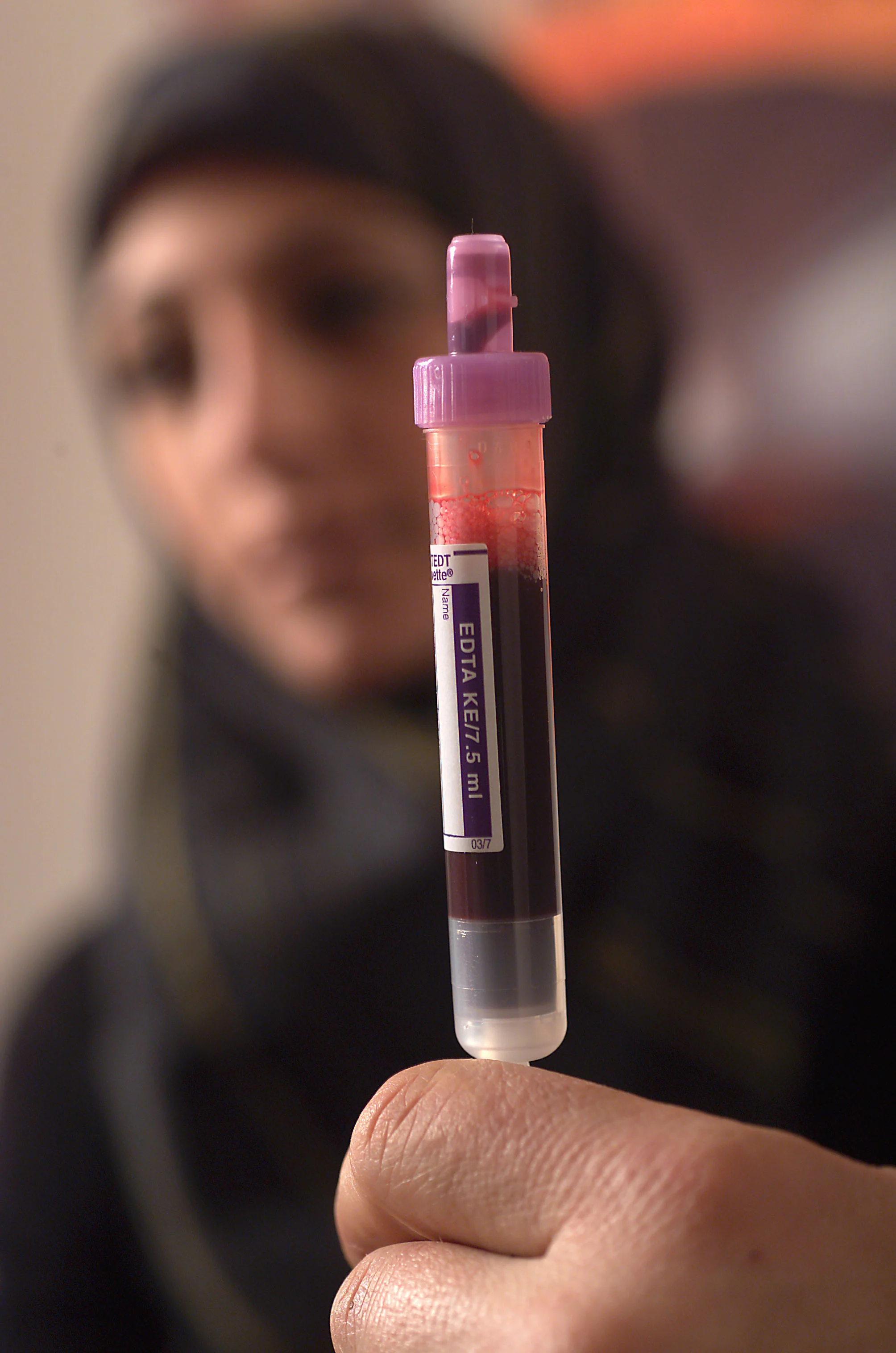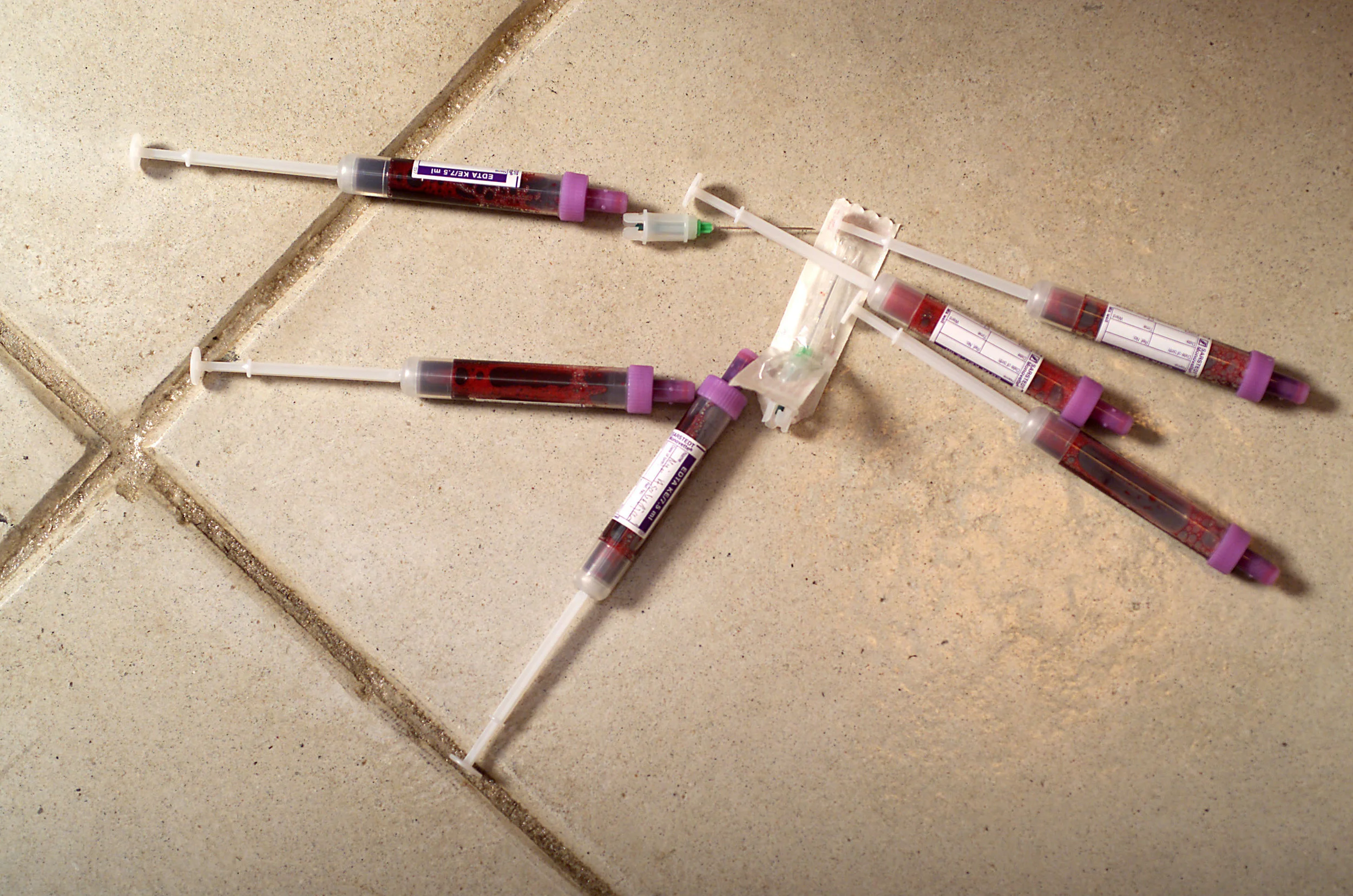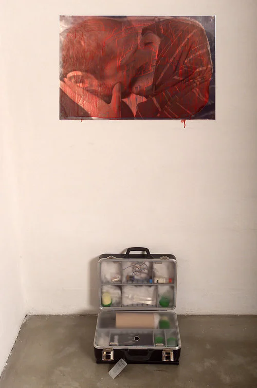 In 2003 Evaristti was commissioned to produce a work for a single day at Trapholt. On the day of the exhibition Evaristti invited a Muslim woman from Lebanon to the museum. The aim was that on the day of the exhibition the two would visit shops in Kolding and purchase the ingredients to make a suicide bomb. Marco Evaristti, who is of Jewish extraction, took the photograph of him and the woman while they kissed. They both drew blood, which was mixed and then applied to the photograph. The ingredients for the bomb are contained in the suitcase.