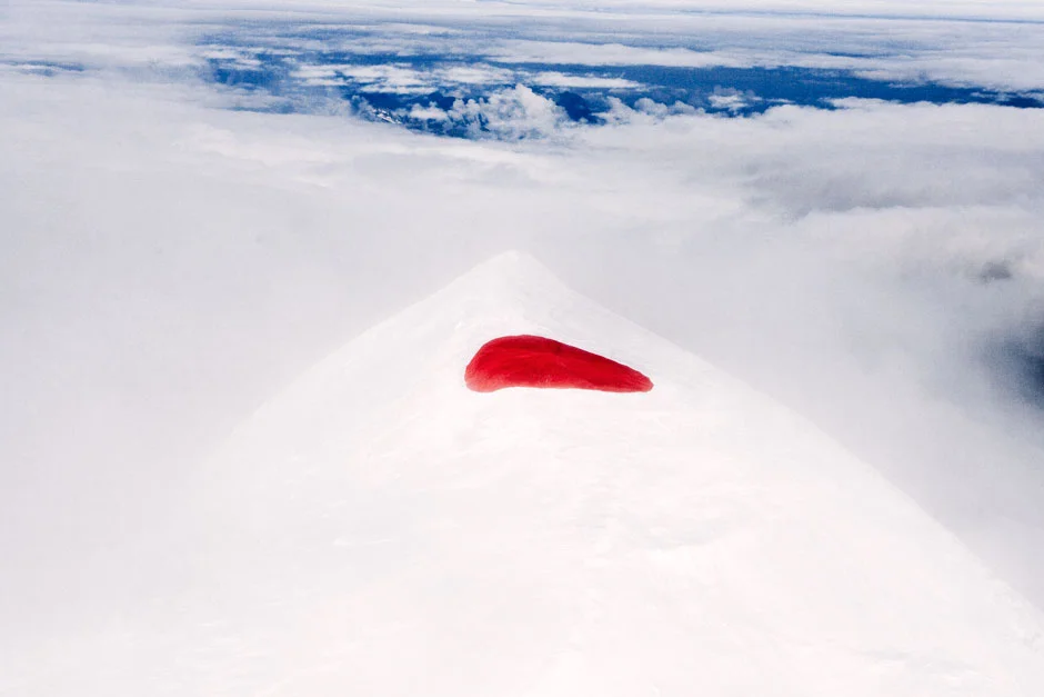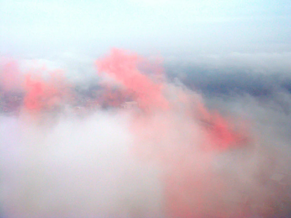 On the opening day for the first complete showing of the Pink State project in Kunsthalle Krems in Austria, Evaristti was forging ahead with a new transitory material – red smoke. From the airspace above the Kunsthalle he dropped his “smoke bomb” from a helicopter which released a cloud of smoke that immediately mixed in with the clouds.